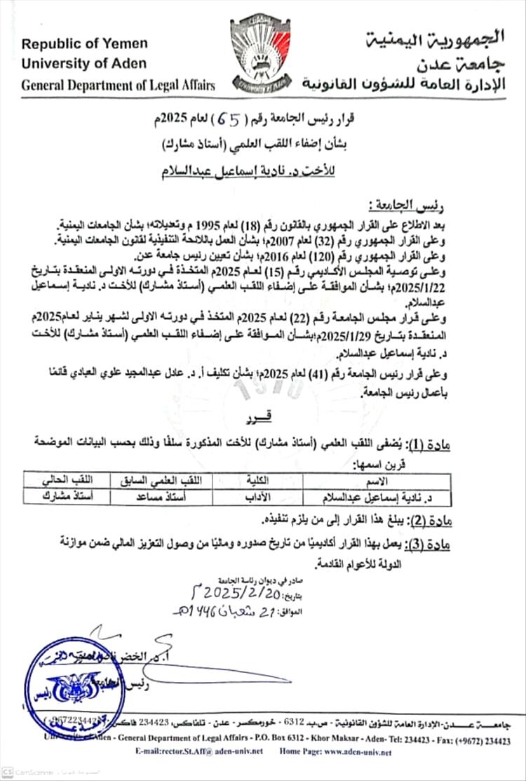 أن هذا التميز يعكس الجهد الكبير الذي بدلته ، ويمثل إضافة نوعية للمجال الأكاديمي والبحثي في جامعة عدن.