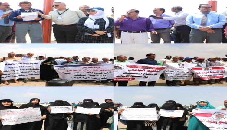 نفذ العشرات من الأكاديميين والمعلمين، صباح اليوم، وقفة احتجاجية أمام مقر التحالف العربي في العاصمة عدن، تحت شعار: "من أجل الكرامة… من أجل التعليم"، للمطالبة بتحسين أوضاعهم المعيشية والوظيفية.