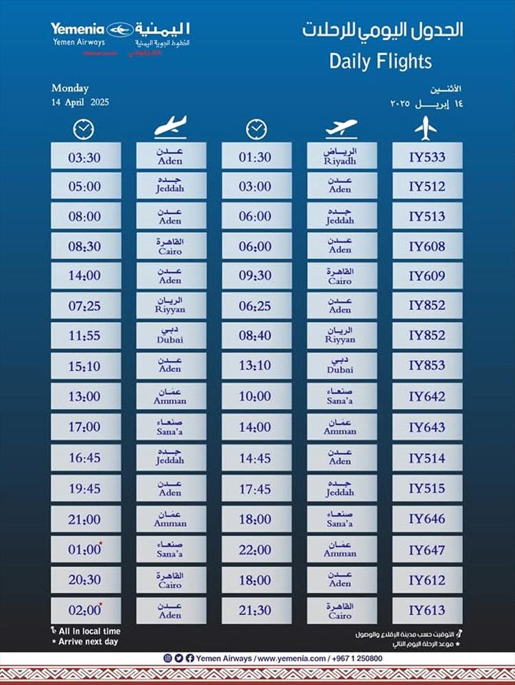 جدول مواعيد اقلاع رحلات طيران اليمنية لليوم الاثنين