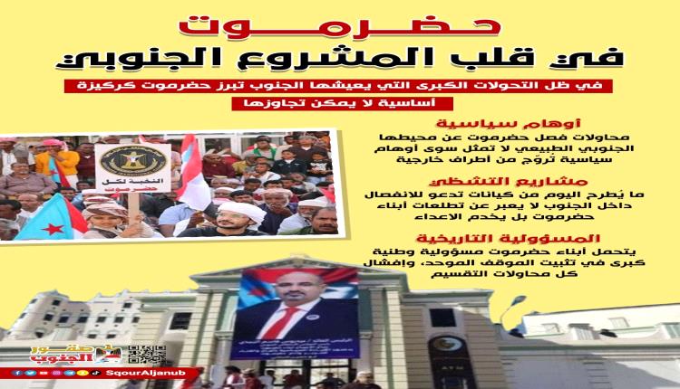 إن الانتقالي لم ولن يقف إلا مناصرا لحقوق ومطالب أبناء حضرموت، وسيظل يسعى مع كافة الخيرين في حضرموت من أجل تعزيز وحدة وتلاحم أبناء حضرموت -عمق الجنوب ودرعه المتين- موقنين جميعا بأن مصيرنا واحد، ومسؤولياتنا مشتركة، وأن العدو يتربص بكم جميعا وأولى مداخله لضربكم هو تمزيق وحدة صفكم، إذ يدركون تماما أن قوتكم في تلاحمكم واصطفافكم وأنهم لن يستطيعون النيل منكم إلا بزرع الفتنة بينكم، كما تدركون أنتم بأن هلاككم وذلكم سيكون في تشرذمكم وانقساماتكم.