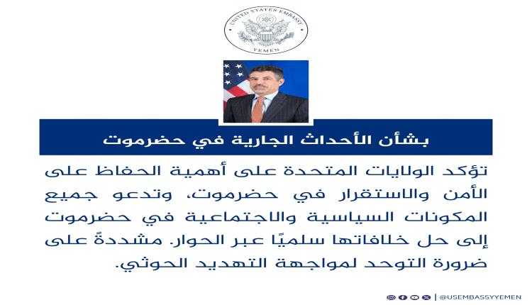وفي البيان الذي تابعه محرر عدن تايم، قالت السفارة : "تؤكد الولايات المتحدة على أهمية الحفاظ على الأمن والاستقرار في حضرموت".