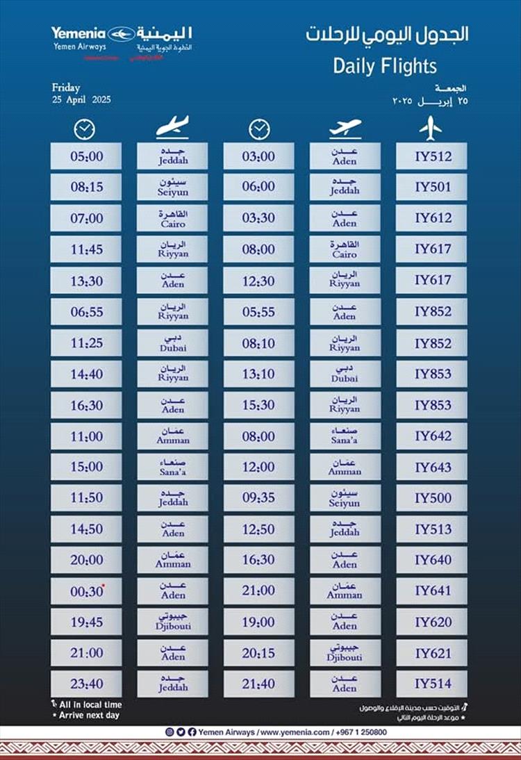 جدول مواعيد اقلاع رحلات طيران اليمنية لليوم الجمعة