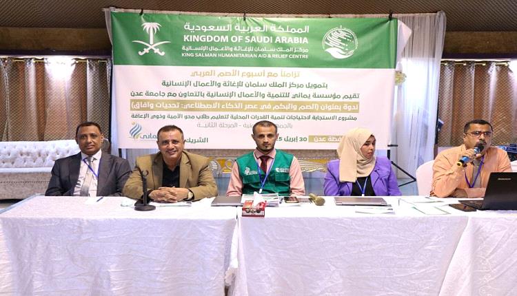 نظمت مؤسسة يماني للتنمية والأعمال الإنسانية، بالتعاون مع جامعة عدن، ندوة بعنوان (الصم والبكم في عصر الذكاء الاصطناعي: تحديات وآفاق) ضمن فعاليات مشروع الاستجابة لاحتياجات تنمية القدرات المحلية لتعليم طلاب محو الأمية وذوي الإعاقة – المرحلة الثانية، بالتزامن مع أسبوع الأصم العربي بتمويل من مركز الملك سلمان للإغاثة والأعمال الإنسانية.