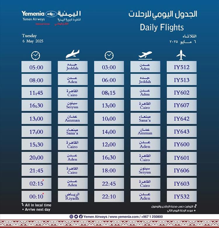 مواعيد اقلاع رحلات طيران اليمنية ليوم غد الثلاثاء كالتالي:
