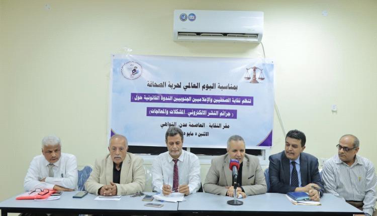 نظمت نقابة الصحفيين والإعلاميين الجنوبيين بمقرها في التواهي الاثنين ندوة قانونية "جرائم النشر الإلكتروني، المشكلات والمعالجات" قدمت إليها أوراق قانونية مقدمة لكل من المستشار الدكتور صالح المرفدي عضو مجلس القضاء الأعلى والقاضي خالد الحسني وكيل نيابة الصحافة والمطبوعات والنشر الالكتروني، ود.عبدالله باصهيب استاذ القانون الجنائي بكلية الحقوق ود.ياسر باعزب ، نائب عميد كلية الصحافة بجامعة عدن.