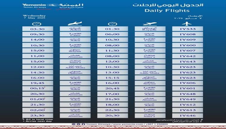 مواعيد اقلاع رحلات طيران اليمنية ليوم غد الاربعاء كالتالي: