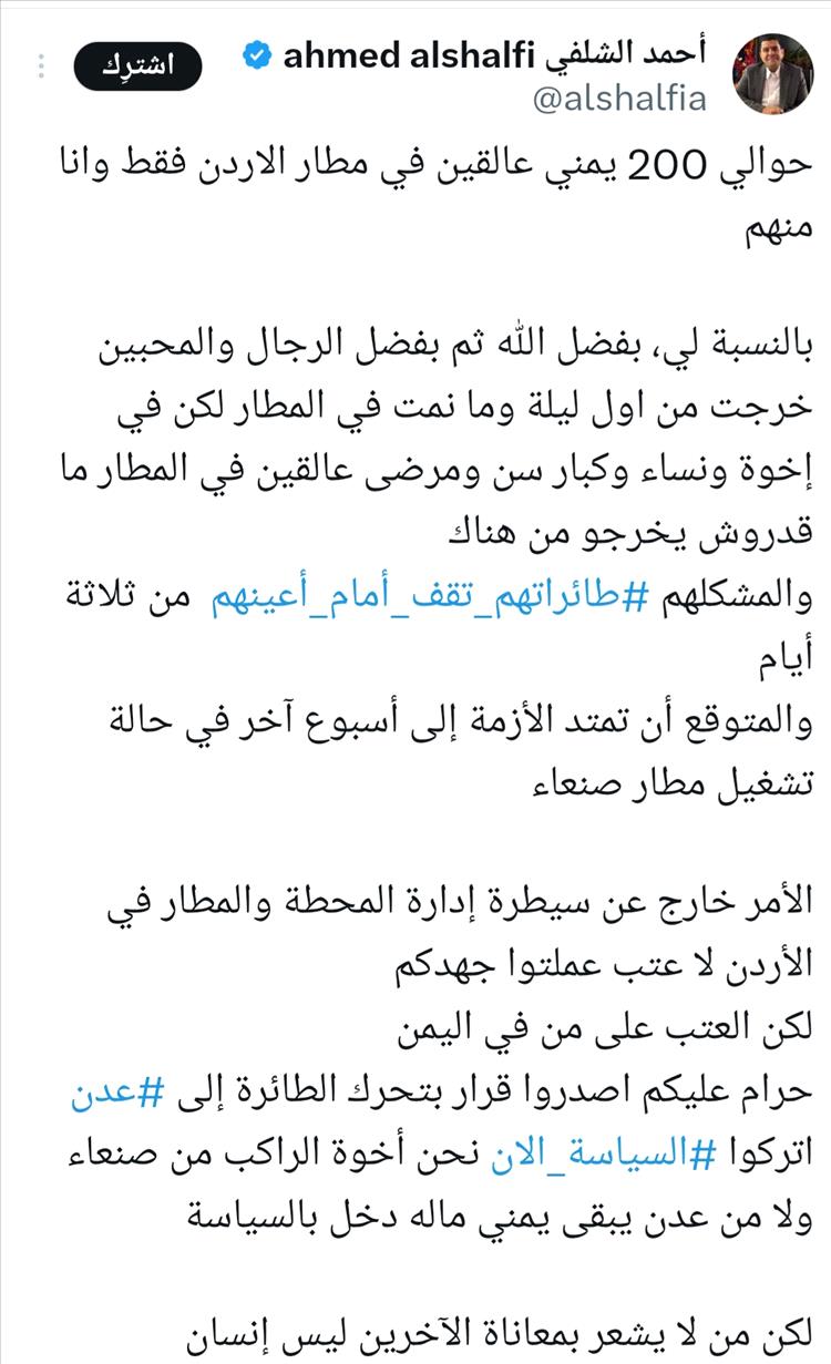 ونشر الشلفي تغريدة على حسابه بمنصة أكس يترحم فيها على 200 يمني عالق بمطار الملكة علياء في انتظار طائرة اليمنية تقلهم الى مطار عدن الدولي بعد تعطل مطار صنعاء وهو أحد ركاب الرحلة لكنه حمد الله ومحبيه غادر قاعة الانتظار الى فندق بالعاصمة عمان حسب قوله في التغريدة وترك أهله وناسه في المطار وراح يستريح في الفندق وبكل وقاحة يترحم عليهم وقال ان هؤلاء قد يستمر تعليقهم الاسبوع.