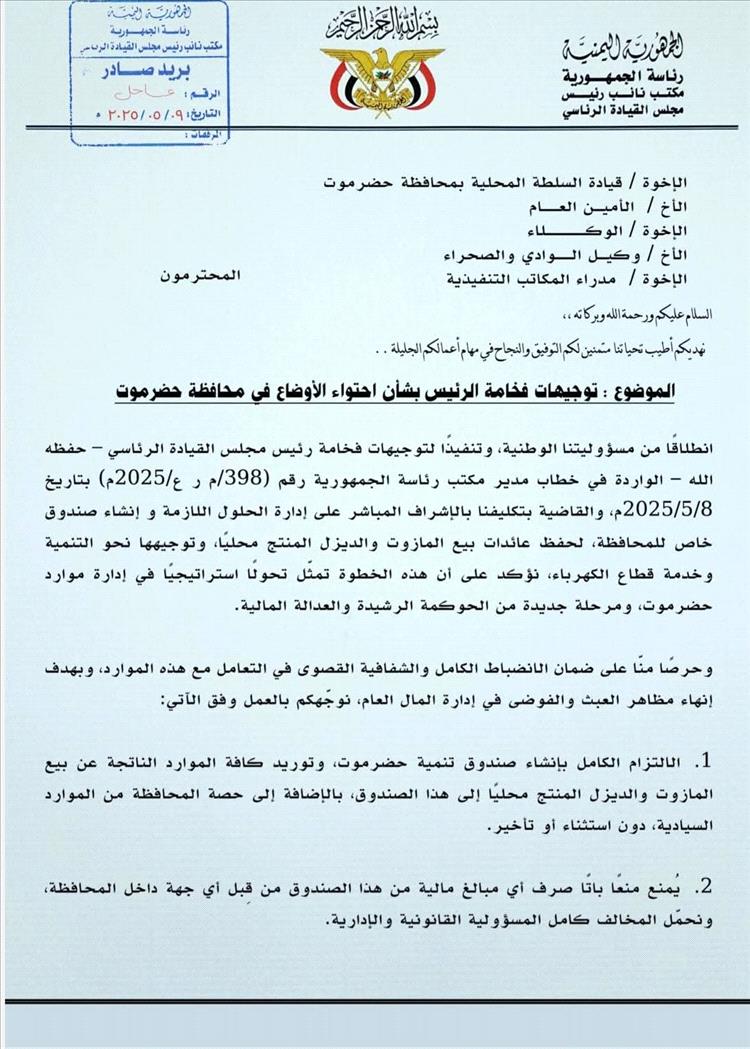 وتضمنت التوجيهات، الالتزام الكامل بإنشاء صندوق تنمية حضرموت، وتوريد كافة الموارد الناتجة عن بيع المازوت والديزل المنتج محليًا إلى هذا الصندوق، بالإضافة إلى حصة المحافظة من الموارد السيادية، دون استثناء أو تأخير، ومنع التصرّف في أي مبالغ مالية من هذا الصندوق من قبل أي جهة داخل المحافظة، ونحمل المخالف كامل المسؤولية القانونية والإدارية، على أن تصرف قيمة المحروقات الخاصة بالكهرباء فقط، من خلال شيك شهري موقع من مدير الصندوق، ومدير مكتب المالية، ومنا شخصيًا، لضمان إحكام الرقابة وعدم تسرب الموارد.