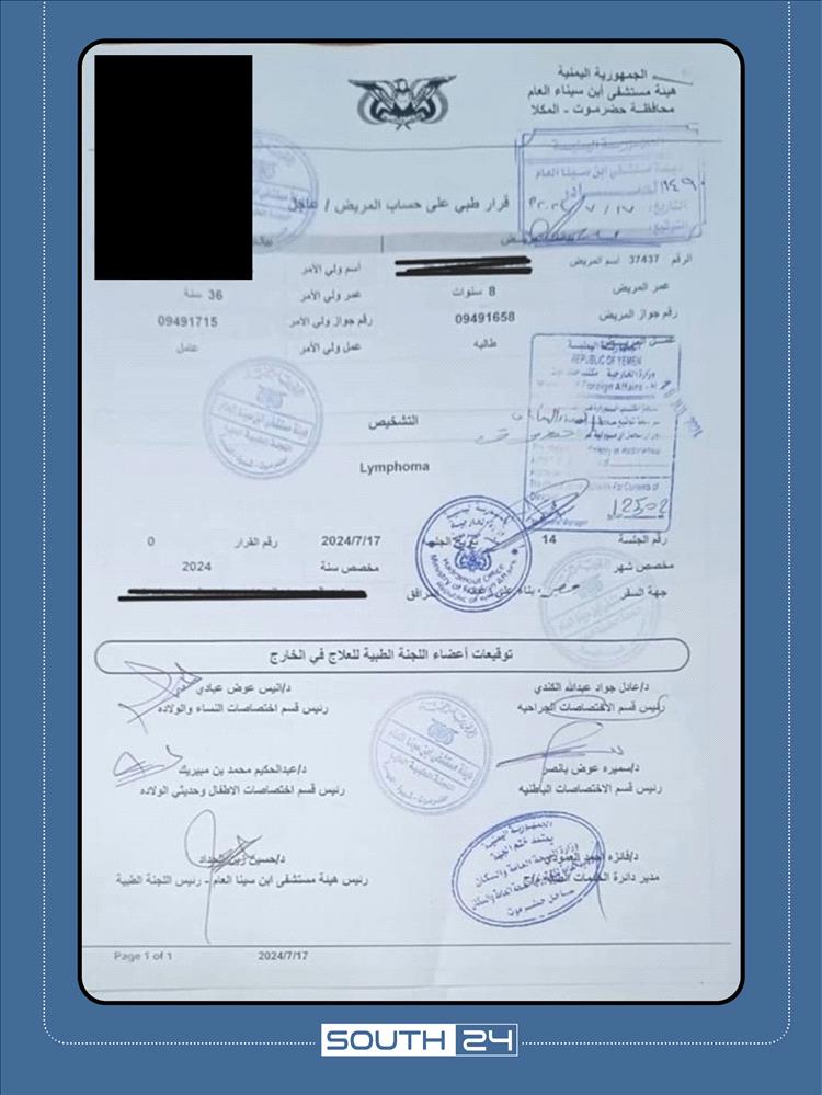 وفي حالة موثقة أخرى من غيل بن يمين، يظهر تقرير طبي صادر عن أحد المستشفيات الحكومية، في يوليو 2024، لطفل يبلغ من العمر ثماني سنوات، يؤكد إصابته بسرطان في البلعوم والجهاز اللمفاوي.