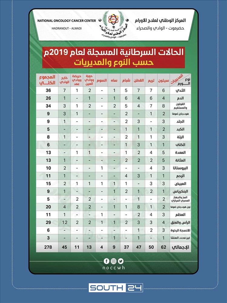 الحالات السرطانية المسجّلة لعام 2019م بحسب النوع والمديريات، وفقًا لإحصائية المركز الوطني لعلاج الأورام – حضرموت الوادي والصحراء