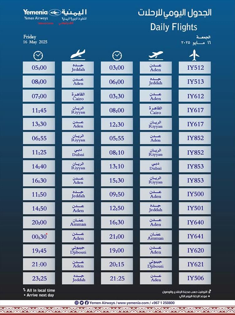 جدول مواعيد اقلاع رحلات طيران اليمنية لليوم الجمعة