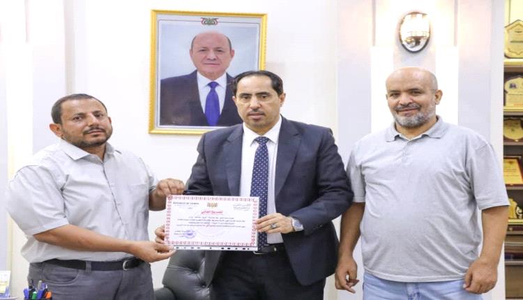 وسلم معالي وزير الشباب والرياضة نايف البكري، الاعتراف النهائي، لرئيس نادي سبأ محمد حسين خميس عطية، بحضور مدير عام الإدارة العامة للاتحادات والأندية فرحان المنتصر.