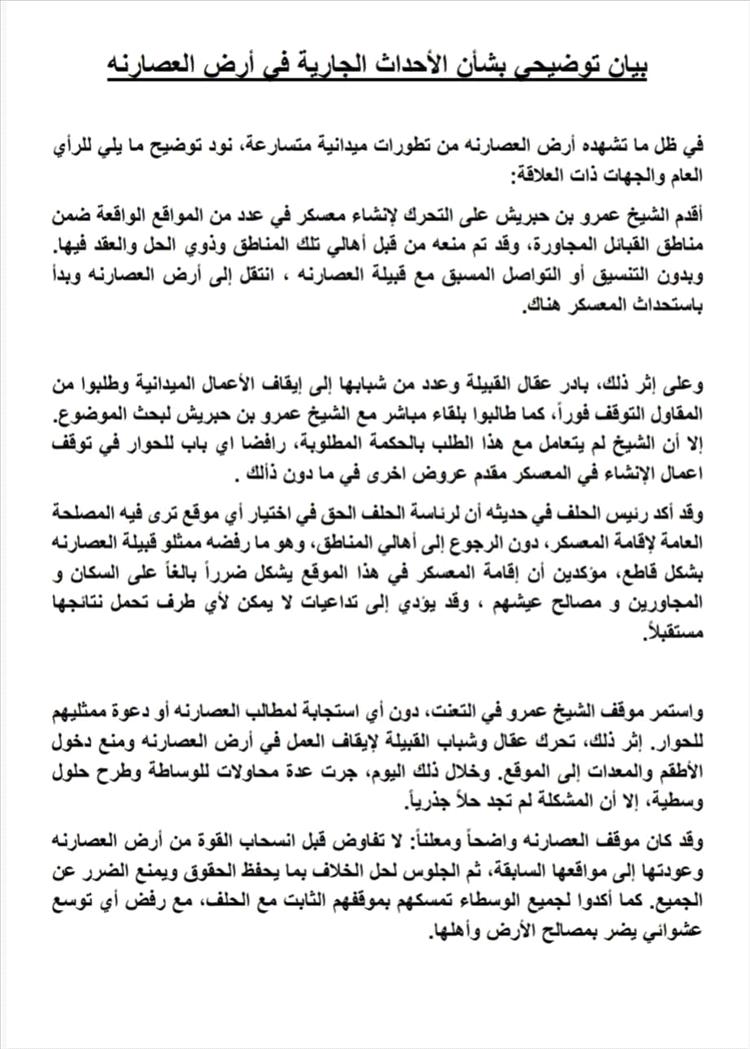 في ظل ما تشهده أرض العصارة من تطورات ميدانية متسارعة، نود توضيح ما يلي للرأي العام والجهات ذات العلاقة: