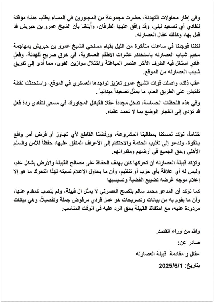 ختامًا: نؤكد تمسكنا بطلبنا المشروع، ورفضنا القاطع لأي تجاوز أو فرض أمر واقع بالقوة، ندعو إلى تحكيم العقل والحكمة والاحتكام إلى الأعراف المتفق عليها، حفظًا للأمن والسلم الأهلي وحق الجميع في أرضهم ومقدراتهم.