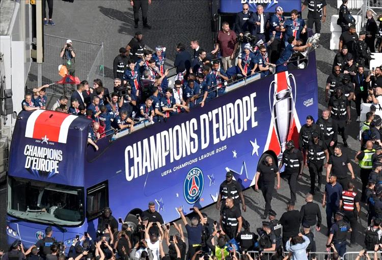 وتشارك عثمان ديمبلي وأشرف حكيمي وماركينيوس وفيتينيا ودويه وفابيان رويز، في رفع الكأس على سطح الحافلة التي زينت باللونين الأزرق والأحمر المميزين للبي إس جي، مع عبارة "أبطال أوروبا".