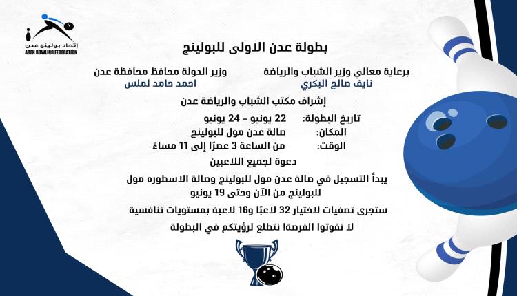 صرح رئيس اتحاد عدن للبولينج يونس أحمد صالح، أن 22 يونيو الجاري إنطلاق بطولة عدن الأولى للبولينج التي ستقام منافساتها في صالة عدن مول للبولينج بمديرية صيرة، برعاية وزير الشباب والرياضة نايف صالح البكري، ووزير الدولة محافظ العاصمة عدن أحمد حامد لملس، وإشراف مكتب وزارة الشباب والرياضة بعدن.