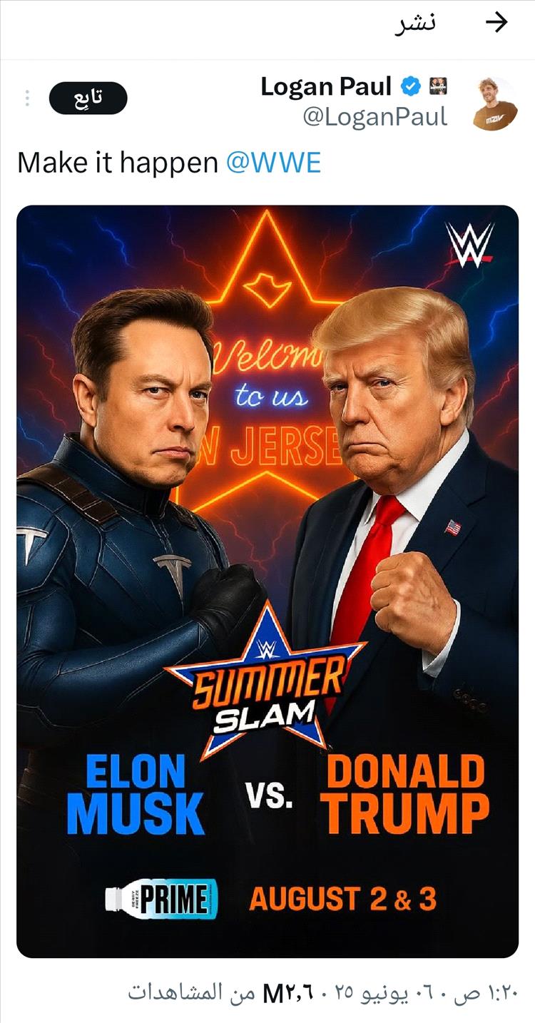 وقال "اليوتيوبر" لوغان بول الذي يشارك في المصارعة العالمية الترفيهية "WWE"، عبر منصات التواصل الاجتماعي: "دعونا نفعل هذا"، ونشر المدون ملصقا مزيفا صمم بمساعدة الذكاء الاصطناعي ورسم عليه وجها لوجه ماسك وترامب وهما يتحضران لنزالات رياضة الفنون القتالية المختلطة (MMA).