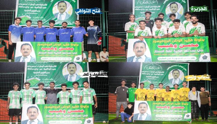لحقت أربع فرق جديدة بركب المتأهلين إلى الدور الثاني من بطولة فقيد الوطن البروفيسور د. محسن وهيب بنسختها الثانية لفئة الممتاز، والتي تقام خلال أيام عيد الأضحى المبارك في الفترة المسائية تحت الأضواء الكاشفة على ملاعب نادي وحدة عدن الرياضي بمديرية الشيخ عثمان، وبتنظيم وإشراف الكابتن نزار السحولي وصلاح الأصبحي.