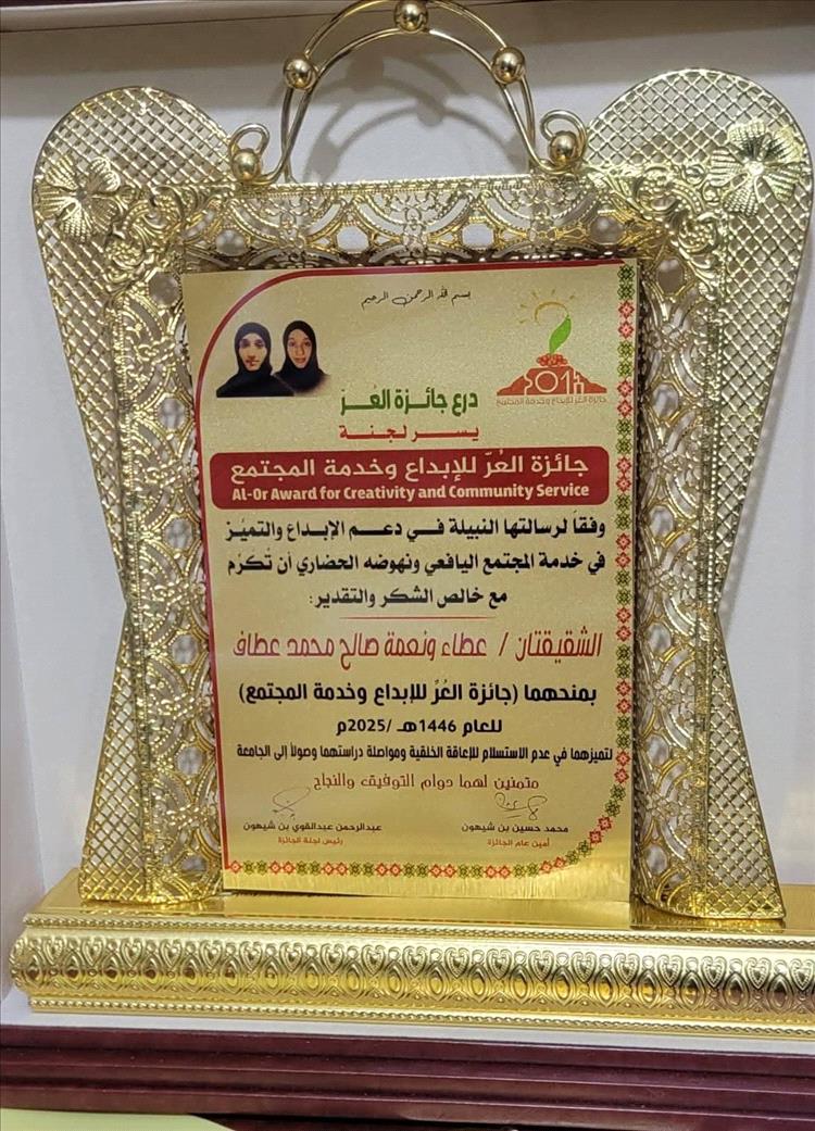 أحسنت لجنة جائزة "العر للإبداع وخدمة المجتمع" حين خصّت هذا العام بالتكريم طالبتين جامعيتين متميزتين من ذوي الهمم، هما الشقيقتان: عطاء صالح محمد عطاف، ونعمة صالح محمد عطاف، اللتان استطاعتا التغلب على إعاقتهما الخُلقية، وشقّتا طريقهما بثقة في دروب العلم، محققتين نجاحات متواصلة منذ المرحلة الابتدائية وحتى التحاقهما بالجامعة؛ وهو أمر نادر في المجتمعات الريفية، حيث غالباً ما يُترك أصحاب الهمم على هامش الحياة.