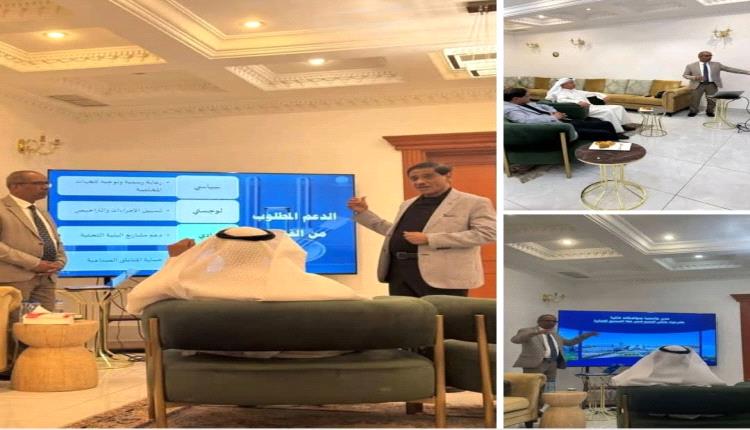 وأستمع اللواء الركن البحسني من القائمين على المشروع إلى شرح حول الوثائق الشاملة التي تضمنت الرؤية الاقتصادية، والأهداف الاستراتيجية، وآليات التمويل، والمشاريع الجاهزة للتنفيذ، والتي من شأنها تحسين البنية التحتية، وخلق آلاف فرص العمل، والمساهمة في إعادة رسم ملامح حضرموت الحديثة خلال السنوات الخمس المقبلة.