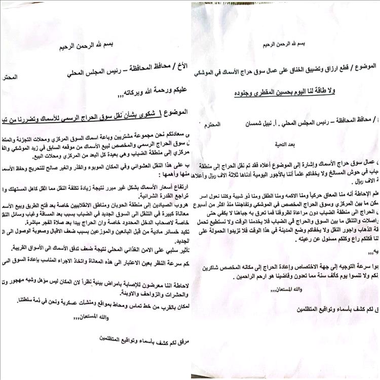 وحذر المتضررون من استمرار الأوضاع على هذا النحو، مطالبين بسرعة إعادة السوق إلى موقعه السابق في منطقة زيد الموشكي القريبة من السوق المركزي، بما يضمن الحفاظ على أرزاقهم وأمنهم وصحتهم، ويعيد التوازن إلى سوق الأسماك في المدينة.