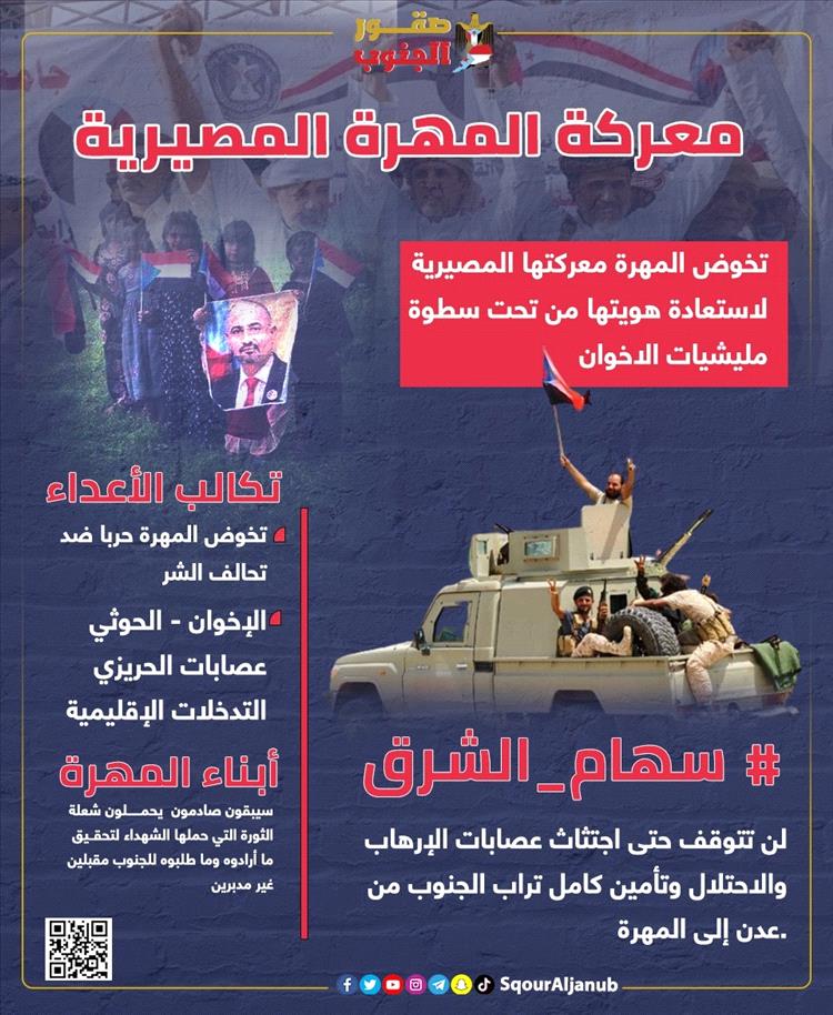 وأشاروا إلى أن المهرة دائمًا ما تكون في قلب المُعترك الجنوبي من أجل الحرية والاستقلال واستعادة الدولة الجنوبية، مثمنين كافة تضحيات أبناء المهرة، باعتبارهم الحصن المتين لقضية شعب الجنوب.