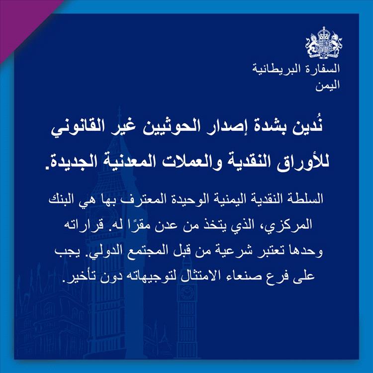 أصدرت الولايات المتحدة الأمريكية والمملكة المتحدة بيانين بشأن إصدار الحوثيين عملات نقدية ورقية ومعدنية حددت موقفا موحدا منها ووصفها بالمزيفة.