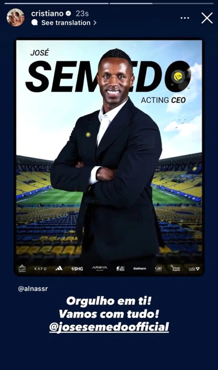 وعلق رونالدو على تعيين خوسيه سيميدو (40 عاما) رئيسا تنفيذيا بنشر صورة إعلان النصر عن التعيين وذلك على حسابه الرسمي على منصة "إنستغرام" مع إضافة عبارات "فخور بك، لنمضي معا بكل شيء".