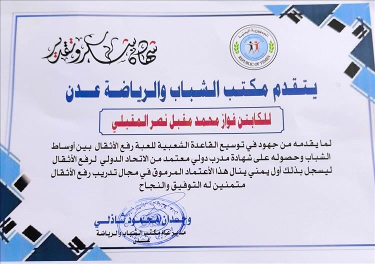 قام الأستاذ وجدان محمود عبد الرحمن الشاذلي، مديرعام مكتب الشباب والرياضة بمحافظة عدن، بتكريم الكابتن فواز محمد مقبل نصر المقبلي، بمناسبة حصوله على شهادة مدرب دولي معتمدة من الاتحاد الدولي لرفع الأثقال (IWF)، ليُسجَّل بذلك كأول يمني ينال هذا الاعتماد المرموق في مجال تدريب رفع الأثقال*.