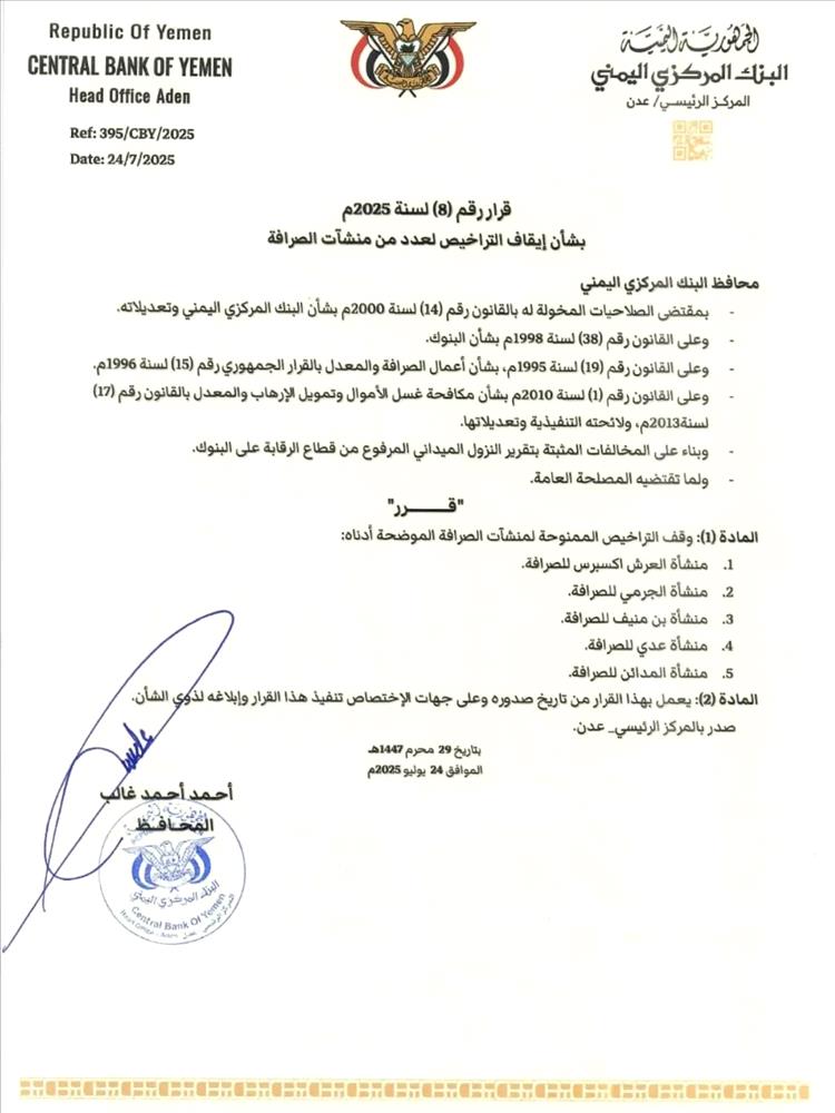 أصدر محافظ البنك المركزي اليمني، الأستاذ أحمد أحمد غالب، القرار رقم (8) لسنة 2025، القاضي بإيقاف التراخيص الممنوحة لعدد من منشآت الصرافة المخالفة، استنادًا إلى تقرير النزول الميداني الصادر عن قطاع الرقابة على البنوك.