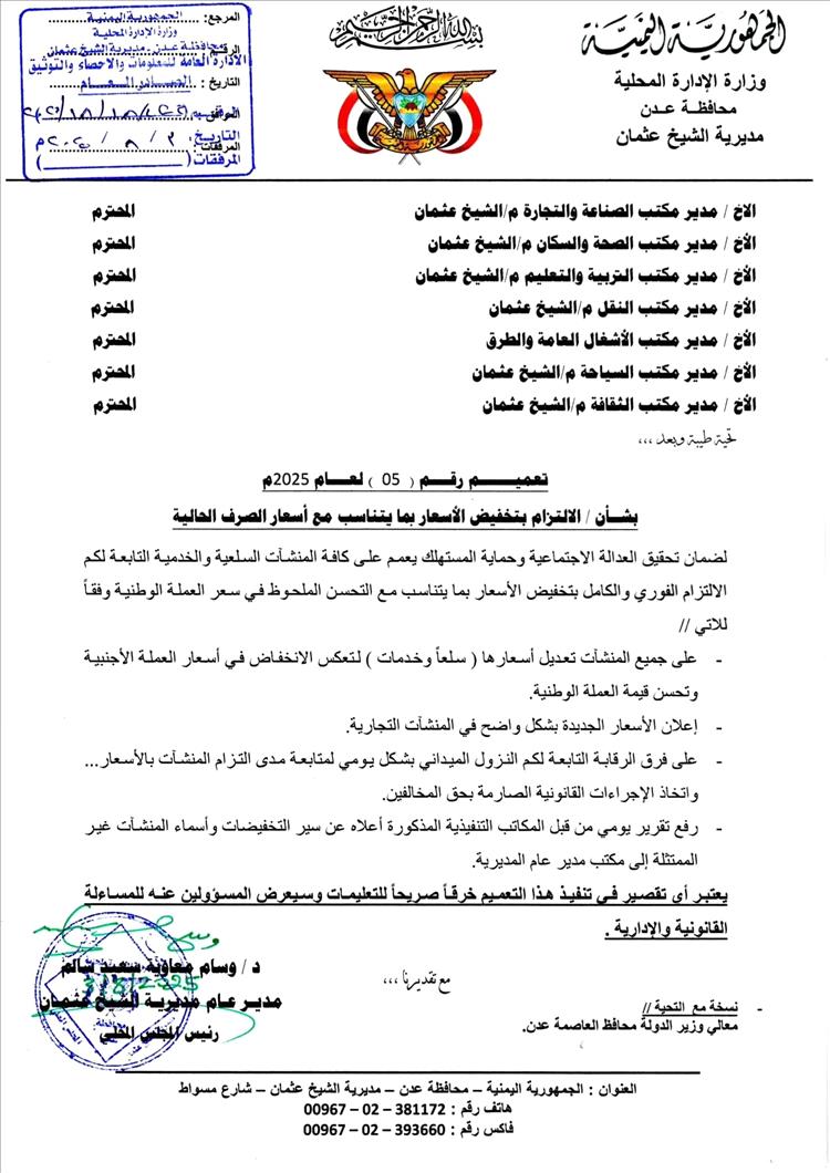 في اجراءات تستهدف حماية المستهلك وضبط الأسواق بكل المجالات، أصدر مدير عام مديرية الشيخ عثمان، الدكتور/ وسام معاوية سعيد سالم، اليوم، تعميمًا عاجلًا يقضي بإلزام كافة المنشآت التجارية والخدمية في المديرية بتخفيض أسعار السلع والخدمات فورًا تماشيًا مع التحسن في سعر العملة الوطنية.