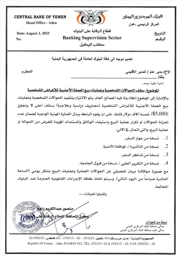 أصدر البنك المركزي اليمني، تعميماً جديداً حدّد فيه سقفاً أعلى لمبالغ الحوالات الخارجية وبيع العملة للأغراض الشخصية، مثل العلاج والدراسة، بـ(5000) دولار أمريكي، مع اشتراط تقديم الوثائق الرسمية الداعمة لتلك العمليات.