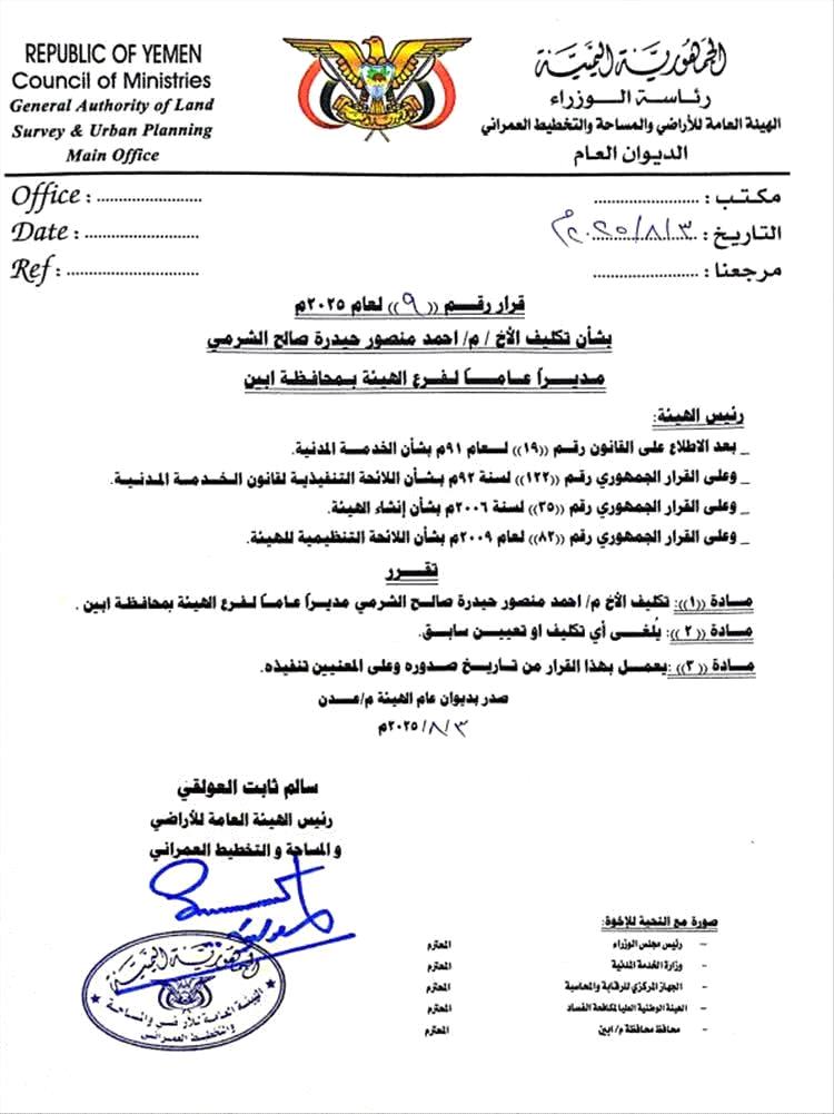 يأتي ذلك بمناسبة تعيين المهندس الشرمي مديرًا عامًا لفرع الهيئة العامة في محافظة أبين، وقد أشاد المفلحي بالقدرات القيادية للمهندس الشرمي، متمنيًا له دوام التوفيق والنجاح في مهامه الجديدة لخدمة الوطن والمواطنين.