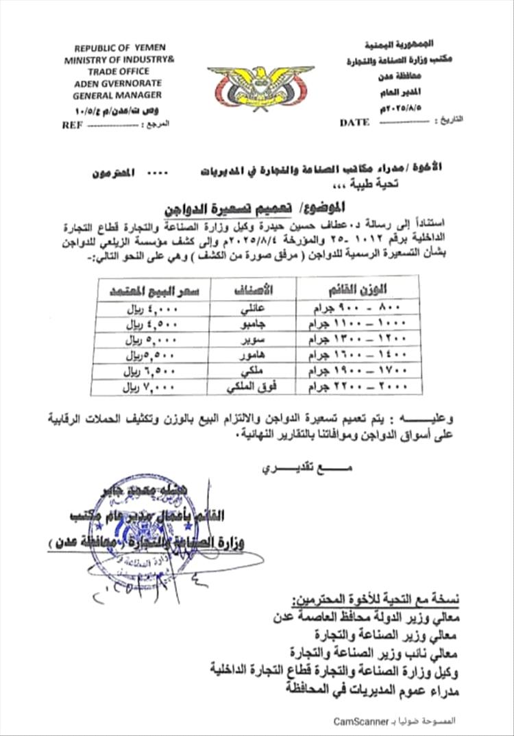 أصدر مكتب وزارة الصناعة والتجارة في العاصمة عدن، اليوم الاثنين الموافق 4 أغسطس 2025، تعميمًا رسميًا بشأن تسعيرة الدواجن في المسالخ، وذلك استنادًا إلى توجيهات وكيل وزارة الصناعة والتجارة لقطاع التجارة الداخلية، الدكتور عاطف حسين حيدرة، وبناءً على الكشف المقدم من مؤسسة الزيلعي للدواجن.