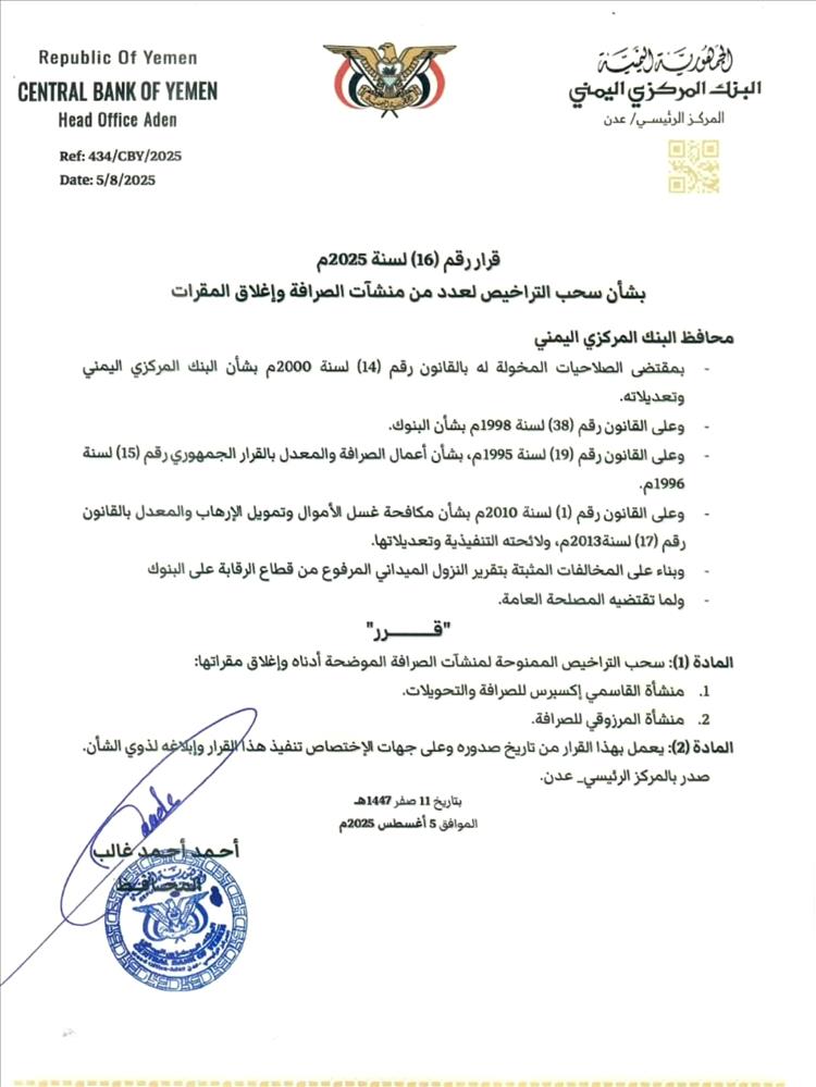أصدر محافظ البنك المركزي أ. أحمد أحمد غالب قرار رقم (16) لعام 2025م، بشأن سحب التراخيص الممنوحة لعددٍ من منشآت الصرافة المخالفة وإغلاق مقراتها، والمثبتة بتقرير النزول الميداني المرفوع من قطاع الرقابة على البنوك.