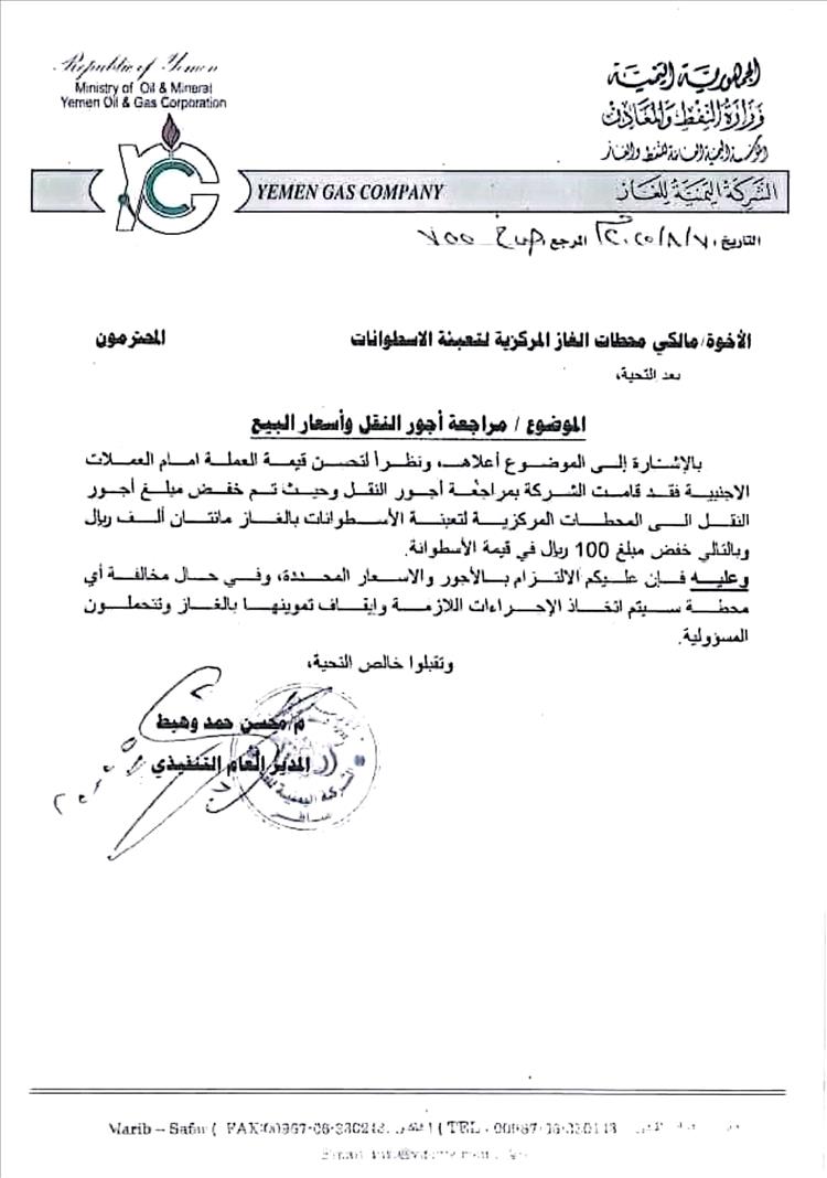 ووجّه ناشطون مناشدة عاجلة إلى دولة رئيس مجلس الوزراء الدكتور سالم بن بريك، والرئيس القائد عيدروس قاسم الزُبيدي، والقائد أبو زرعة عبد الرحمن المحرمي، للتدخل الفوري ومراجعة آلية تسعير الغاز المنزلي، وإلزام الشركة اليمنية للنفط والغاز بخفض الأسعار بما يتناسب مع نسبة تحسن العملة، حمايةً لحقوق المواطنين ورفعًا للمعاناة عن كاهلهم.