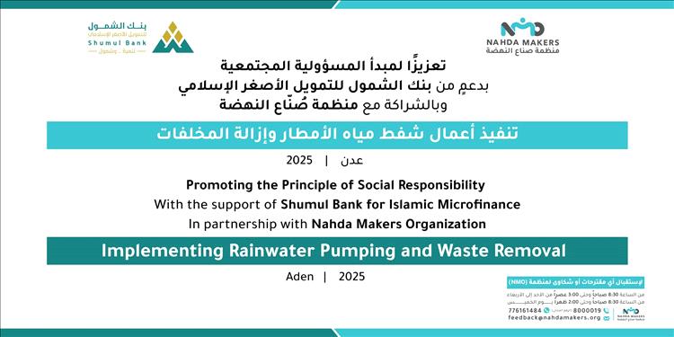 انطلاقًا من مبدأ المسؤولية المجتمعية وحرصًا على صحة وسلامة الأهالي في مدينة عدن، نفّذ بنك الشمول للتمويل الأصغر الإسلامي، بالتعاون مع منظمة صُنّاع النهضة، مبادرة لشفط مياه الأمطار الراكدة وإزالة الركام الذي خلّفته السيول في الشوارع والأحياء.