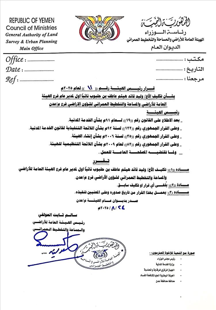 ⬛ صدور قرارات رئيس الهيئة العامة للأراضي بتكليفات جديدة في فرع الهيئة عدن