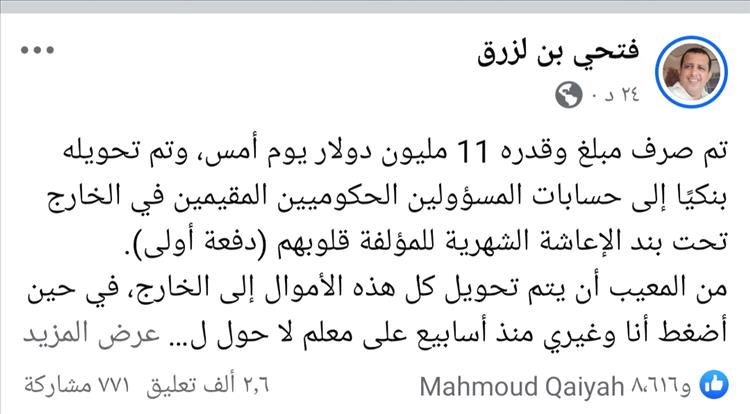 كشف الصحفي فتحي بن لزرق عن إتمام "صرف مبلغ وقدره 11 مليون دولار يوم أمس، وتم تحويله بنكيًا إلى حسابات المسؤولين الحكوميين المقيمين في الخارج تحت بند الإعاشة الشهرية للمؤلفة قلوبهم (دفعة أولى)".
