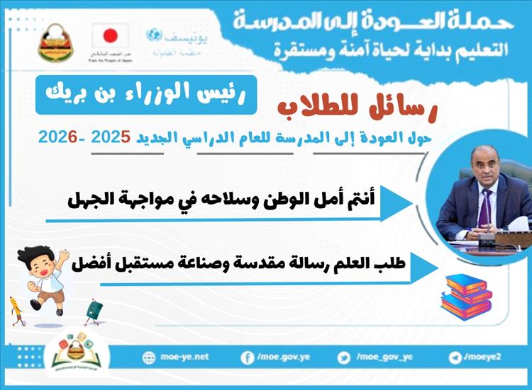 وجّه دولة رئيس الوزراء، الدكتور سالم بن بريك، رسائل مهمة للمعلمين والطلاب في مختلف المحافظات، بمناسبة تدشين العام الدراسي الجديد 2025 – 2026.