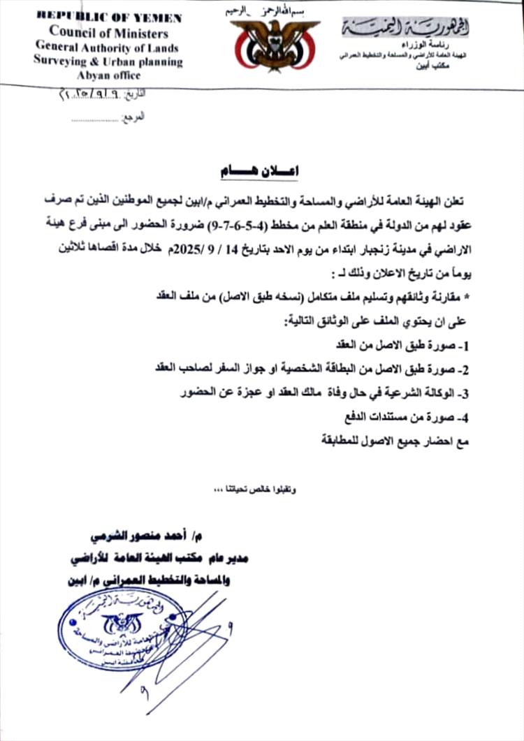 تعلن الهيئة العامة للأراضي والمساحة والتخطيط العمراني م/ابين لجميع الموطنين الذين تم صرف عقود لهم من الدولة في منطقة العلم من مخطط (4-5-6-7-9) ضرورة الحضور الى مبنى فرع هيئة الاراضي في مدينة زنجبار ابتداء من يوم الاحد بتاريخ 14 / 2025/9م خلال مدة اقصاها ثلاثين يوماً من تاريخ الاعلان وذلك لـ :