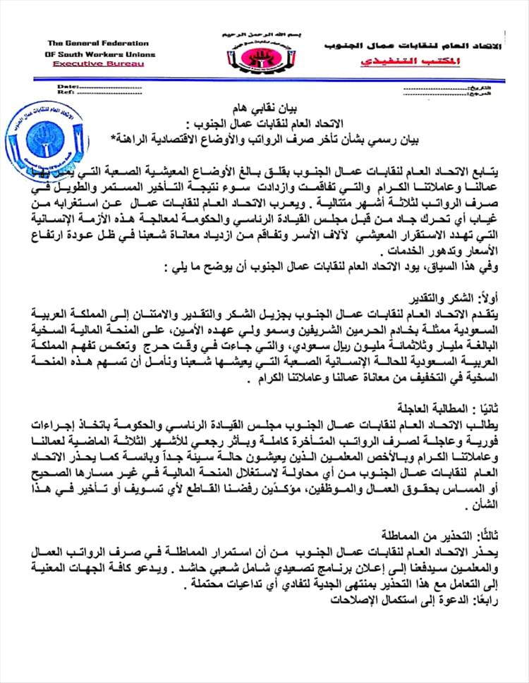 يتقدم الاتحاد العام لنقابات عمال الجنوب بجزيل الشكر والتقدير والإمتنان إلى المملكة العربية السعودية ممثلة بخادم الحرمين الشريفين وسمو ولي عهده الأمين، على المنحة المالية السخية البالغة مليار وثلاثمائة مليون ريال سعودي، والتي جاءت في وقت حرج وتعكس تفهم المملكة العربية السعودية للحالة الإنسانية الصعبة التي يعيشها شعبنا ونأمل أن تسهم هذه المنحة السخية في التخفيف من معاناة عمالنا وعاملاتنا الكرام .