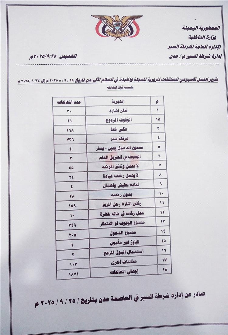 أعلنت شرطة السير في العاصمة عدن أن إجمالي المخالفات المرورية المسجَّلة خلال الفترة من 26 سبتمبر حتى 1 أكتوبر 2025م، بلغ (1971) مخالفة مرورية، بزيادة قدرها (90) مخالفة عن الأسبوع الماضي.