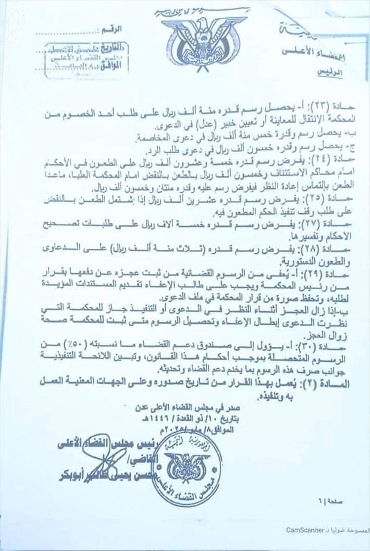 لقد صدر القرار رقم (41) لسنة 2025م عن رئيس مجلس القضاء الأعلى، بشأن تعديل القانون رقم (26) لسنة 2013م الخاص بالرسوم القضائية، استنادًا إلى تفويضٍ قيل إنه صادرٌ من رئيس مجلس القيادة الرئاسي.