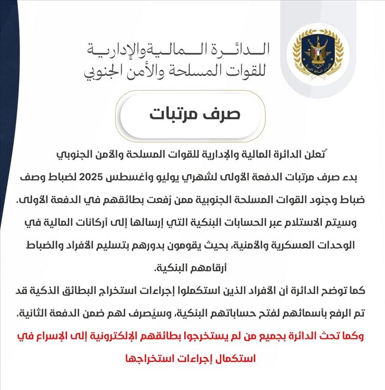 اعلنت الدائرة المالية والإدارية للقوات المسلحة والأمن الجنوبي عن بدء صرف مرتبات الدفعة الأولى لشهري يوليو وأغسطس 2025 لضباط وصف ضباط وجنود القوات المسلحة الجنوبية