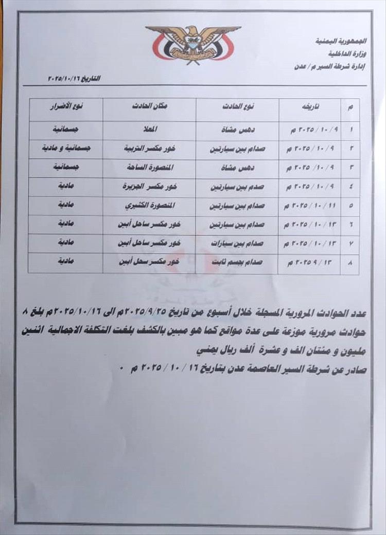 سجلت إدارة شرطة السير بالعاصمة عدن خلال الفترة من 9 حتى15 أكتوبر 2025م عددًا من المخالفات والحوادث المرورية ضمن تقاريرها الأسبوعية التي ترصد مستوى الالتزام بقواعد وأنظمة المرور في مديريات العاصمة.