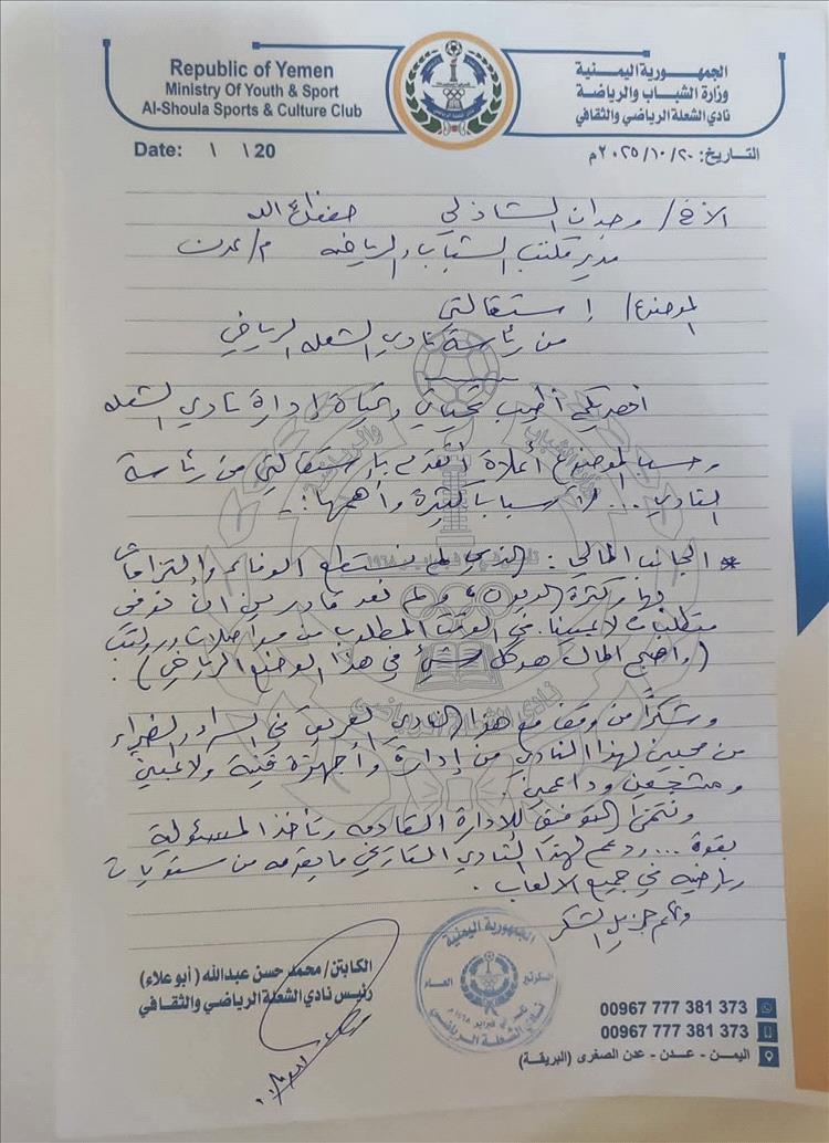 ووجه ابو علاء استقالته إلى مدير عام مكتب الشباب والرياضة الكابتن وجدان الشاذلي، مهديا إياه في مستهلها تحياته وتحيات إدارة نادي الشعلة، موضحا بذلك تقديم استقالته بحسب الموضوع المذكور أعلى الوثيقة.