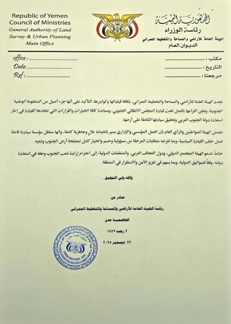 تعلن قيادة وكوادر وموظفو ديوان عام الهيئة العامة للأراضي والمساحة والتخطيط العمراني، تأييدهم الكامل والصريح للقرارات السيادية الحاسمة التي اتخذتها القيادة السياسية الجنوبية، والمعبرة عن الإرادة الحرة لشعب الجنوب، ممثلة بفخامة الرئيس القائد عيدروس بن قاسم الزُبيدي، رئيس المجلس الانتقالي الجنوبي والقائد الأعلى للقوات المسلحة الجنوبية.