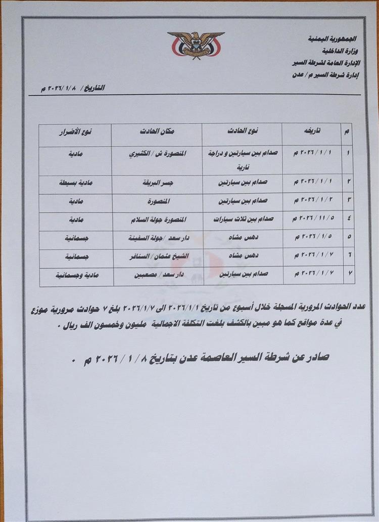 أصدرت إدارة شرطة السير في العاصمة عدن تقريرها الأسبوعي حول المخالفات والحوادث المرورية المرصودة خلال الفترة من 1 إلى 7 يناير 2026م في إطار جهودها المستمرة لتنظيم الحركة المرورية وتعزيز السلامة على الطرقات.