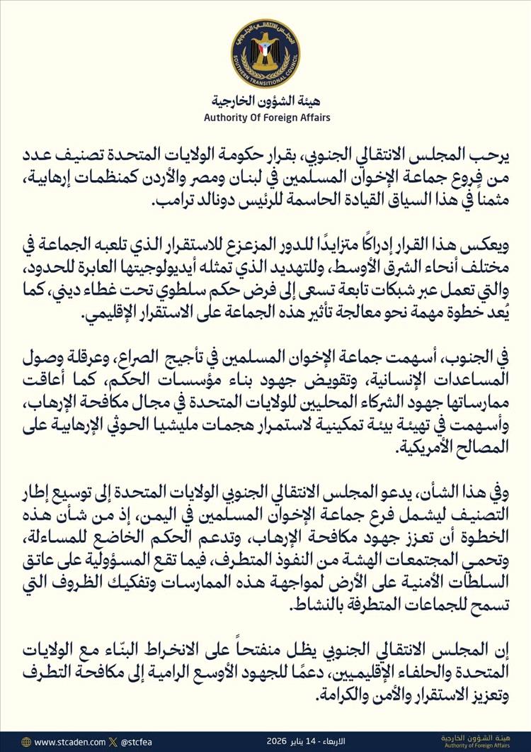 وأكد المجلس الانتقالي انفتاحه على الانخراط البنّاء مع الولايات المتحدة والحلفاء الإقليميين لتعزيز الأمن والاستقرار، مشددًا على التزامه بتفكيك الظروف التي تسمح للجماعات المتطرفة بالنشاط، وعلى مسؤولية القوى الأمنية على الأرض في مواجهة الأيديولوجيات السلطوية المتسترة بالدين وتأمين المنطقة من مختلف التهديدات.